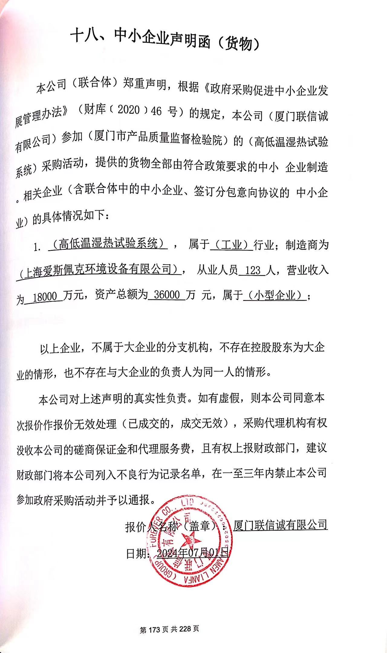 厦门万翔-竞争性磋商-XM2024-TZ0282高低温湿热试验系统项目中标(成交)结果公告